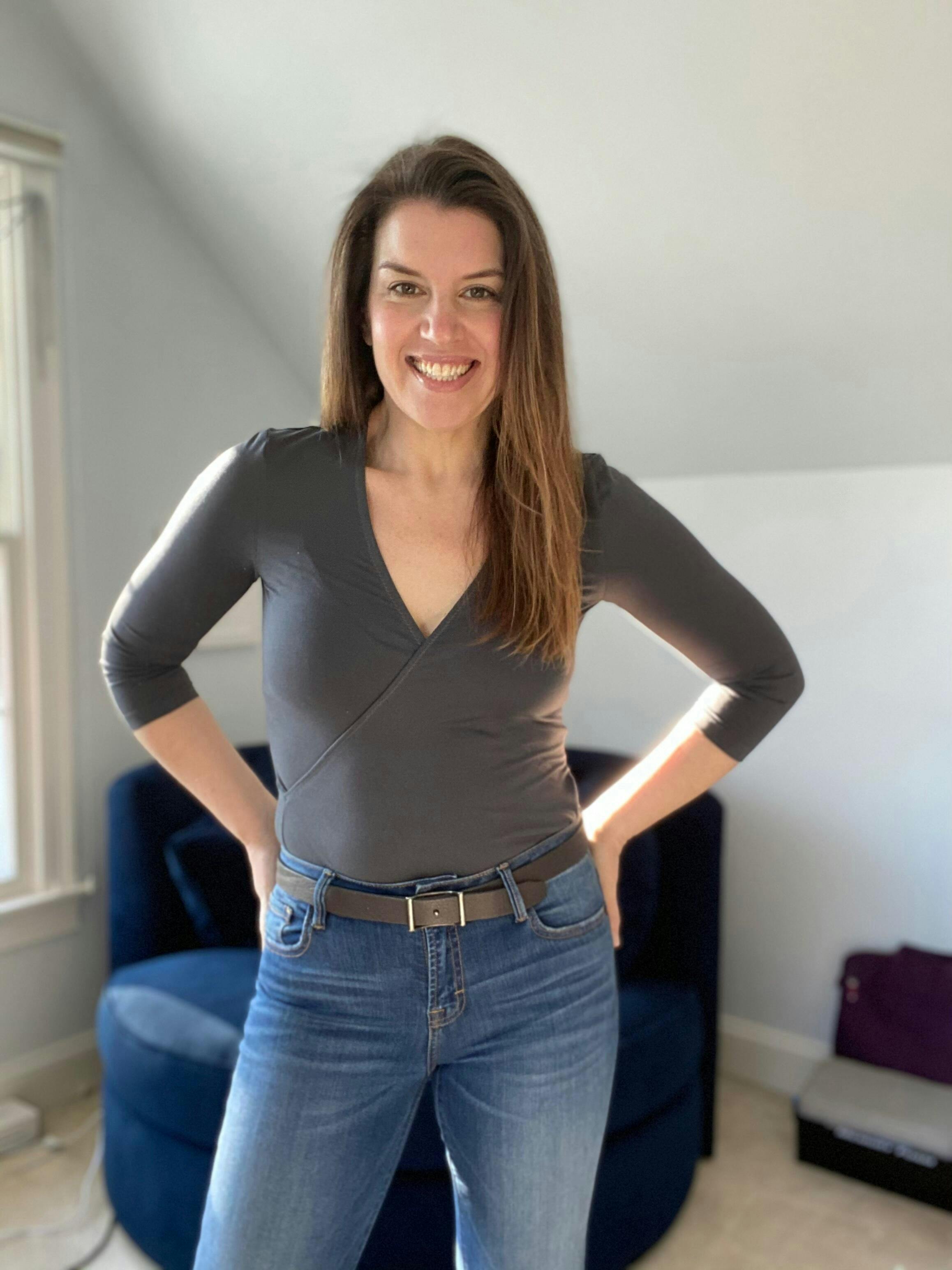 The Elio Top is a fitted knit top with a faux wrap silhouette. The neckline is finished with narrow elastic that allows the bodices to lay flush against the body. The hem is finished with optional fold over elastic so that it creates a smooth fit under high-waisted pants and skirts. Three sleeve lengths (cap, elbow, and long) make this design ideal for year-round wear.